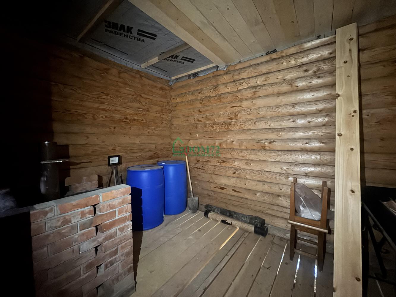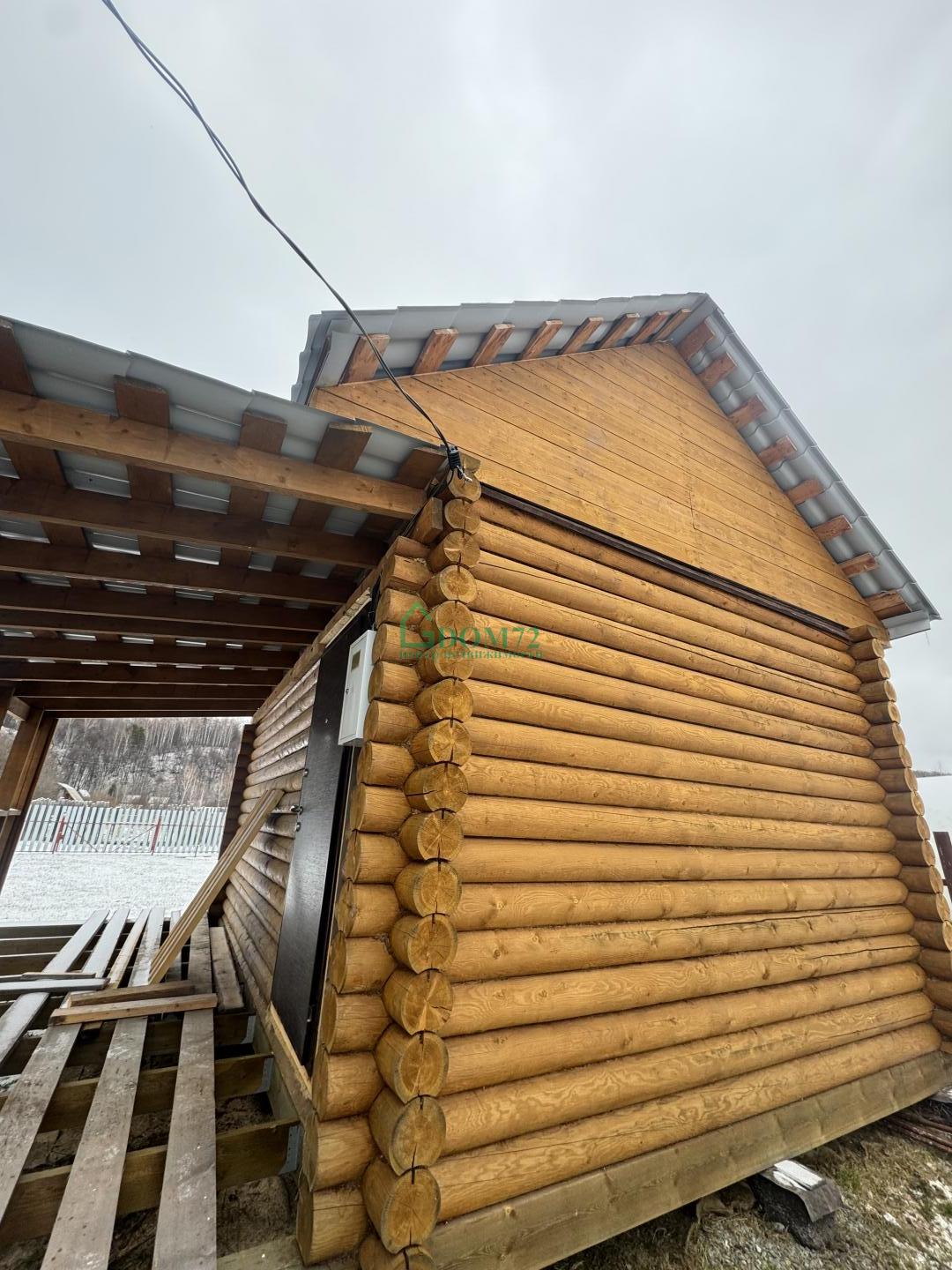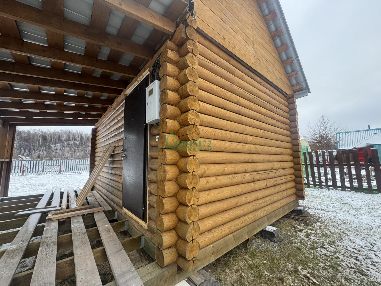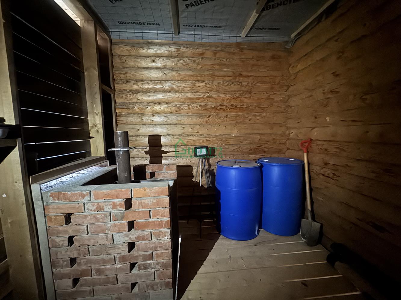 На территории — баня из оцилиндрованного бревна 6×4 м с террасой. Внутри уже сделаны пол, потолок, установлена печь, осталось немного доделать — и можно париться хоть каждые выходные! 🔥
