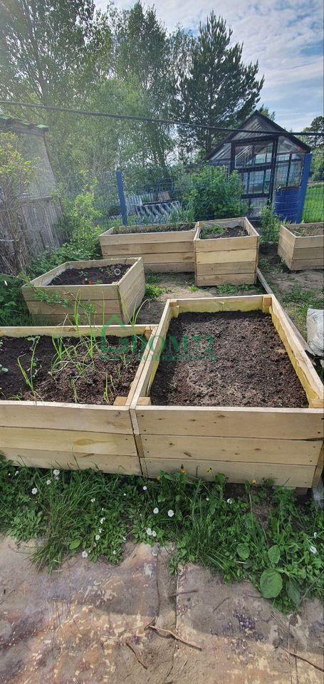 Зона огорода: Высокие грядки, теплица, ягодные кустарники (смородина черная, коасная, розовая, белая, крыжовник черный, малина) и деревья (вишня, черноплодная рябина, жимолость, ирга, облепиха).